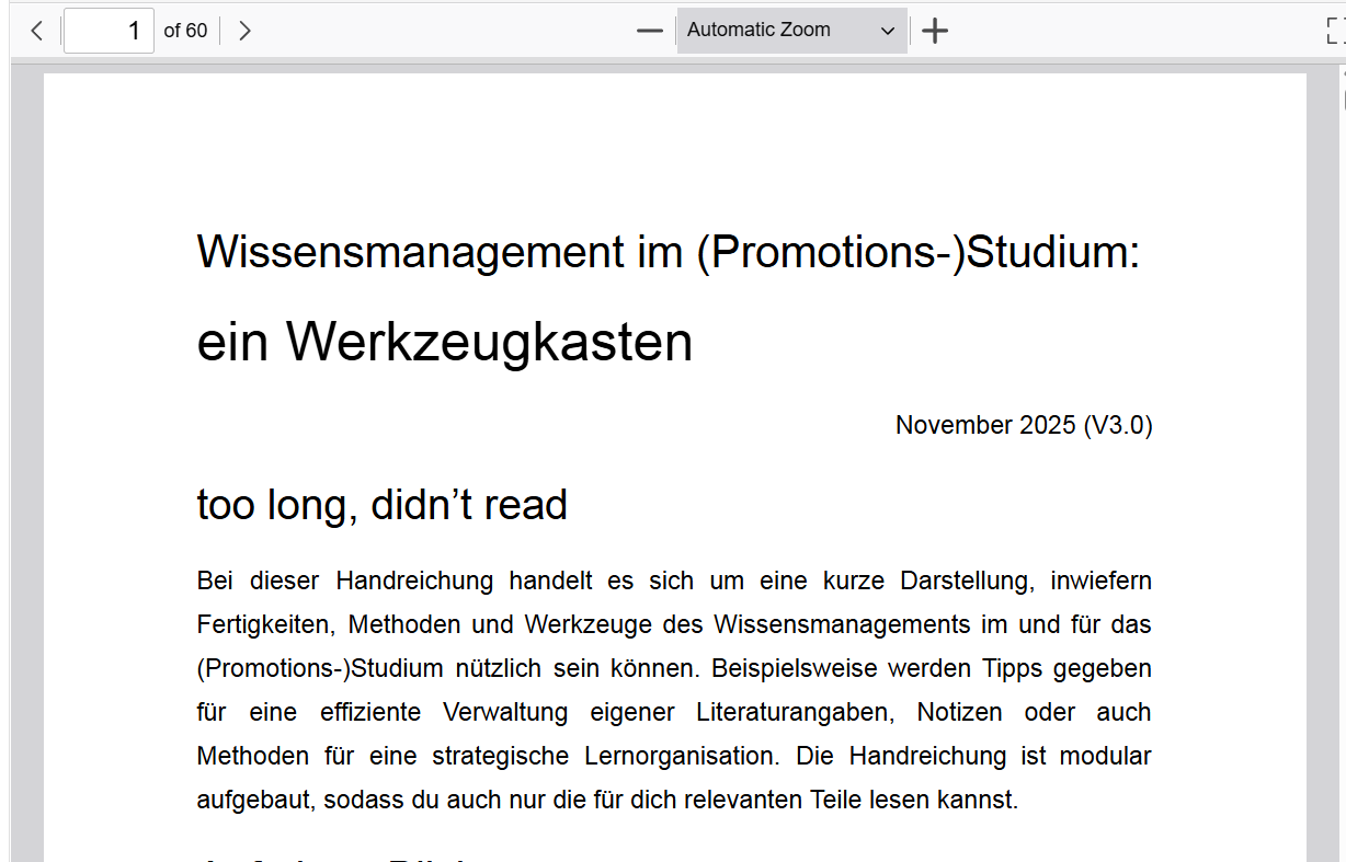 Gerne möchte ich auf die gelungene Handreichung Wissensmanagement im (Promotions)Studium hinweisen, die in den letzten Monaten durch eine Fachgruppe der GfWM erarbeitet wurde. Diese Gruppe durfte ich von außen ein klein wenig mit meiner Expertise in diesem Thema unterstützen. Das Arbeitsergebnis liegt nun vor und ist – nicht nur für Studierende – absolut lesenswert.